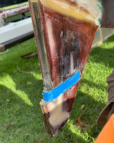 Before we went to Maui last weekend, we got to do some fun power washing on ʻAʻĀ—shout out to my boss for letting us borrow the power washer! And today, while I was sick in bed watching Heated Rivalry, Chris was patching ʻAʻĀ up with fiberglass from Fiberglass Hawaiʻi, alongside our friend Alex. I hope it all went well!